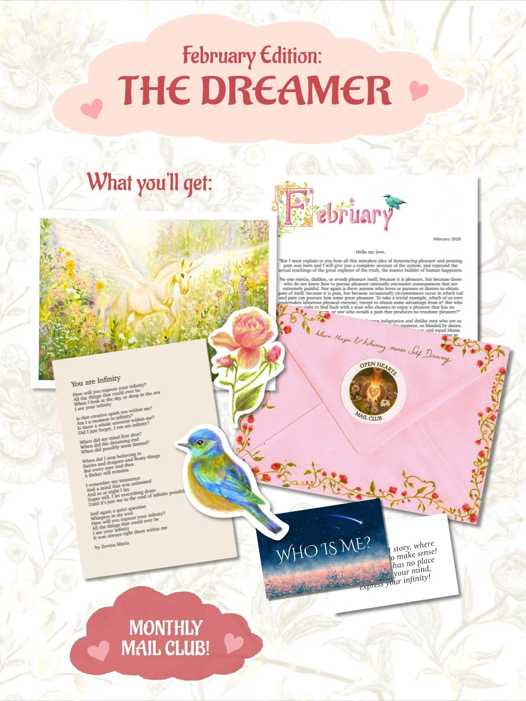 This is Open Hearts Mail Club! Each month you can receive a package in the mail full of whimsical handmade magic! My Mail Club is all about Whimsy and Self Discovery!